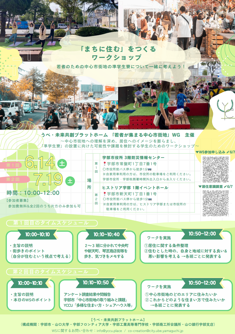 現在、宇部市では、うべ・未来共創プラットホーム「若者が集まる中心市街地」WGが主催となり、中心市街地への「準学生寮」設置に向けたプロジェクトを進めています。